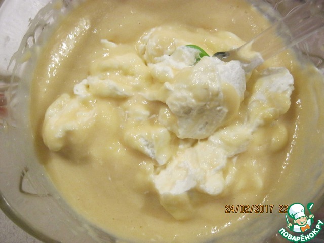 Затем в три приема ввести в смесь взбитые сливки, аккуратно перемешивая лопаткой складывающими движениями.