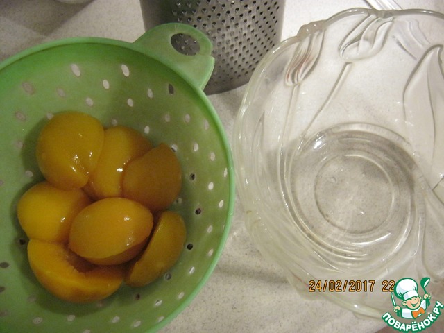 - Персик (консервированные, большая банка, масса персиков 470 грамм) — 1 бан.