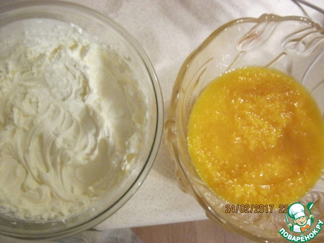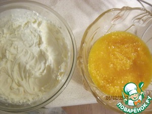В персиковое пюре также в три приема, аккуратно перемешивая, ввести сливки. Выложить получившуюся массу поверх грушевого баваруа. Делать это осторожно, чтобы слои были ровные. Убрать заготовку в холодильник до полного застывания.