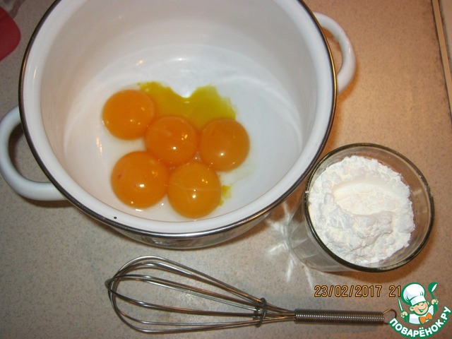 Пока печется бисквит, приготовим заварную часть баваруа. Для этого желтки хорошо смешаем с крахмалом и сахаром.