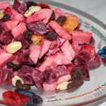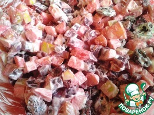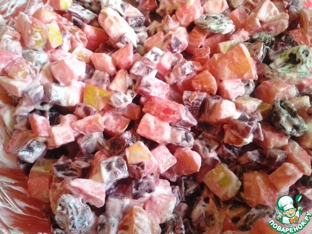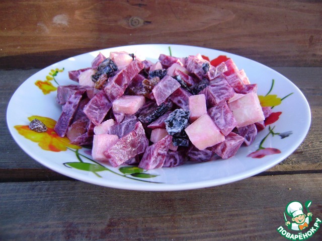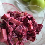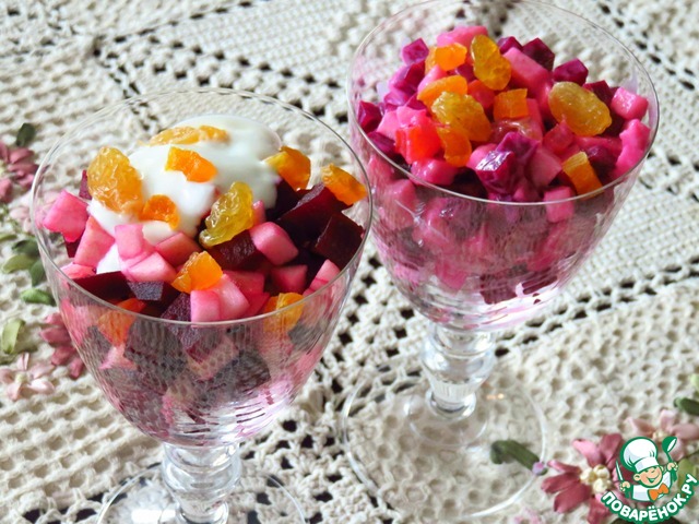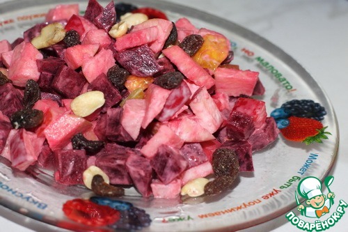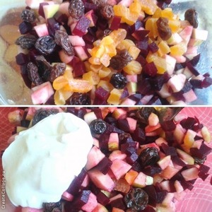 На следующий день быстро приготовила салат-десерт: яблоки и свёклу нарезала, не очищая; сухофрукты перед добавлением в салат замочила в воде (чтобы убрать лишнюю пыль/грязь); заправила натуральным греческим йогуртом; сахарную пудру не использовала; охлаждала перед подачей 40 минут.