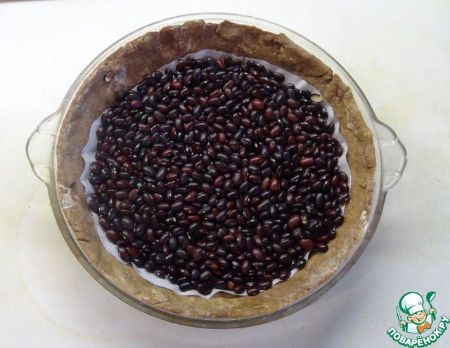 Охлажденное тесто раскатать в пласт 3 мм и выложить в форму, смазанную маслом. Размер моей формы-20 см. Бортик сформируйте около 2-х см. Уберите основу в холодильник на 30 минут. Затем прикройте пергаментом, насыпьте фасоль и выпекайте 15 минут при 180 градусах.