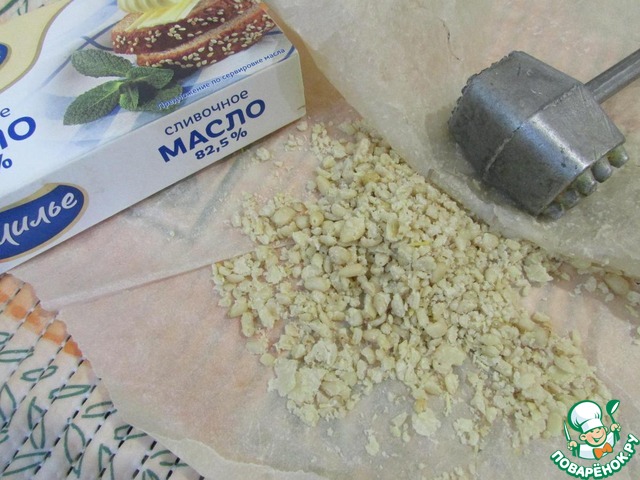 Приготовить кедровый штрейзель. Кедровые орехи растолочь в крошку.