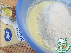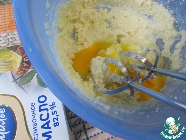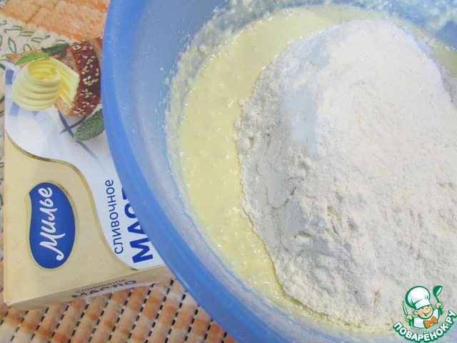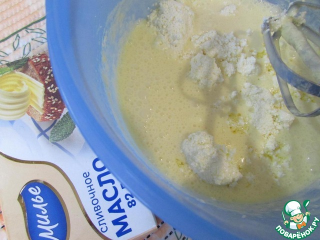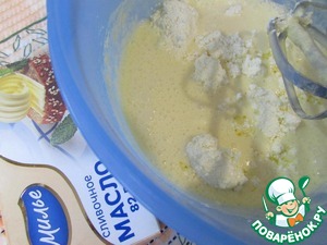 Приготовить творожное тесто. Просеять муку, добавить разрыхлитель и тщательно перемешать.