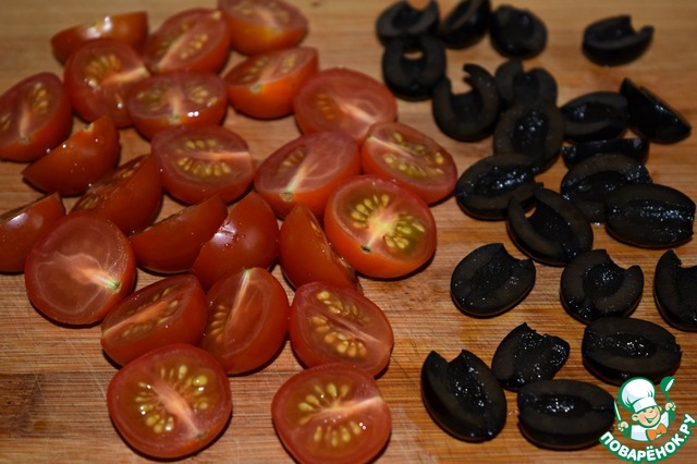 Помидоры черри и маслины разрезать пополам.