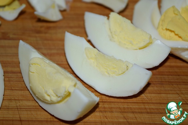 Яйца отварить и нарезать на шесть долек каждое.