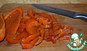 Перец достать из пакета. Удалить семена, снять кожицу и нарезать мякоть полосками.