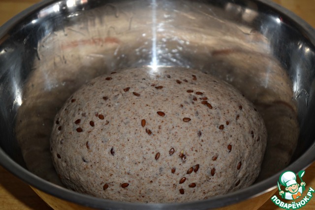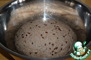 Смешать три вида муки (просеять), опару, соль, мед, дрожжи (3 г), семена льна (вода за ночь полностью впиталась) и воду комнатной температуры. Замесить тесто. Все ингредиенты я смешиваю с помощью миксера, а затем вымешиваю тесто руками на рабочей поверхности, присыпанной небольшим количеством муки. Тесто получается довольно плотное, но не очень тугое.