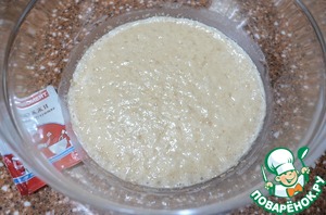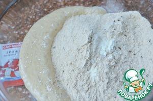 Всыпать сухую смесь в опару, влить оставшуюся воду.