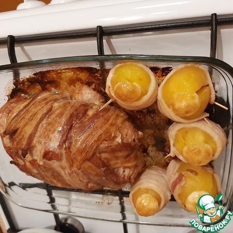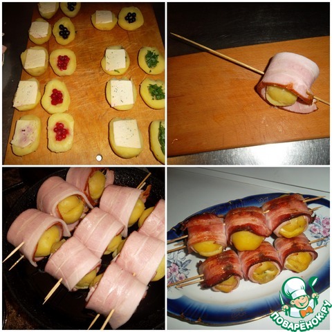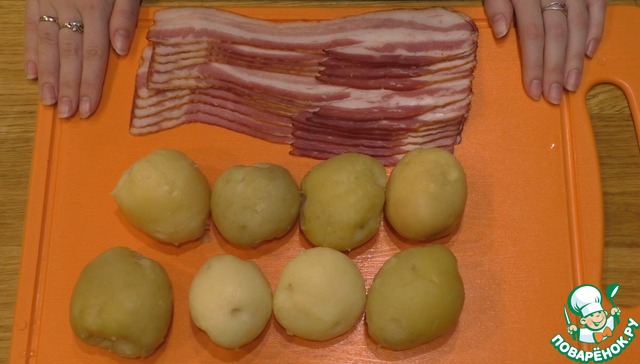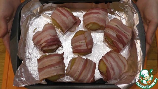 5. Завернутую в бекон картошку уберите в заранее разогретую до 200 градусов духовку на 15-20 минут.