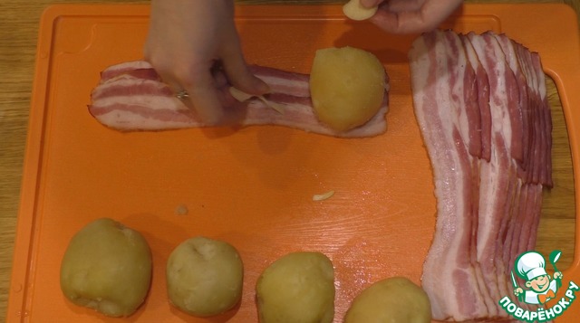 4. Перед тем как завернуть картошку в бекон, её нужно хорошенечко посолить, а на ломтики бекона выложить кусочки чеснока.