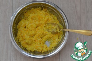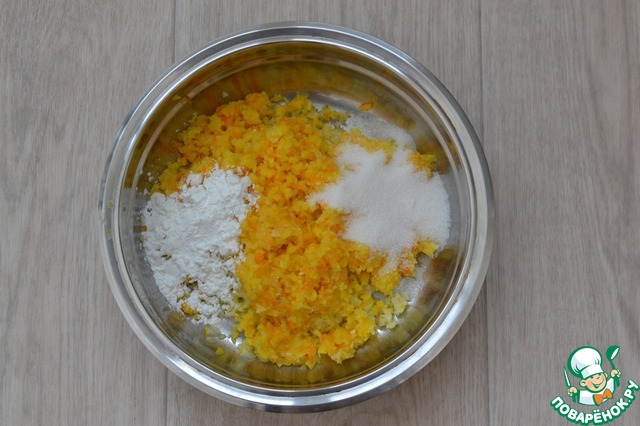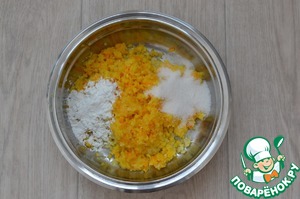 Измельчить в блендере лимон и апельсин, добавить сахар и крахмал.