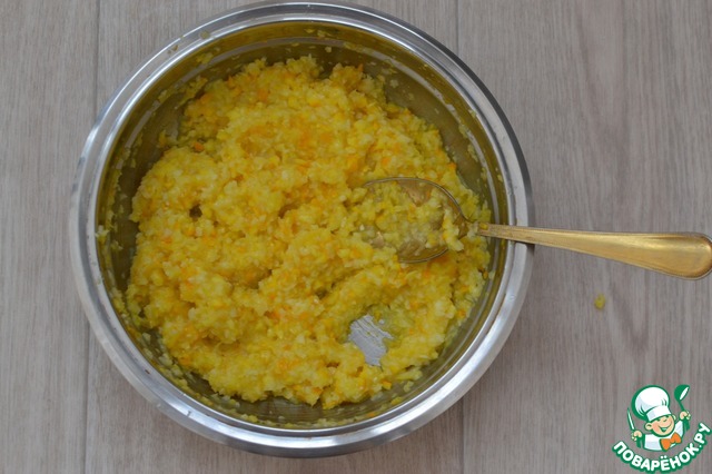 Вынимаем форму из духовки, убираем горох и выкладываем начинку.
