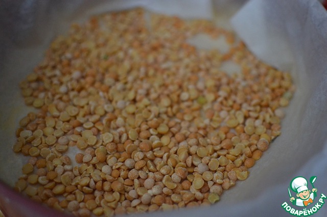 На тесто положить пергамент и насыпать сухого гороха (чтобы тесто не поднималось при выпечке). Выпекать минут 15 при 200 градусов