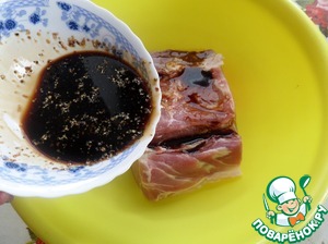 Мясо выкладываем в чашку. Добавляем приготовленный маринад. Оставляем на 1 час в холодильнике. (В течении этого времени я переворачивала мясо 3 раза.)