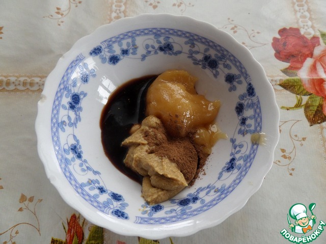 Готовим 2-ой маринад. В чашку выкладываем мед, горчицу, корицу и соевый соус (1 ст. л.).