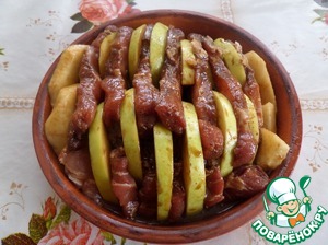 Между кусками мяса выкладываем ломтики замаринованных яблок и листочки шалфея.