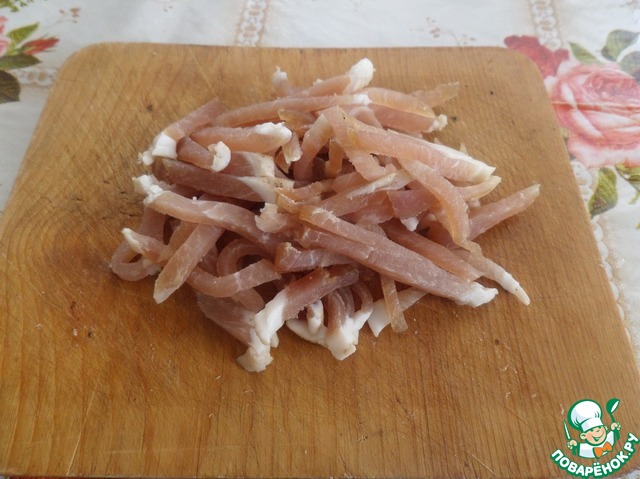 Нарезаем соломкой копченое мясо. (Мясо собственного приготовления -копчения).