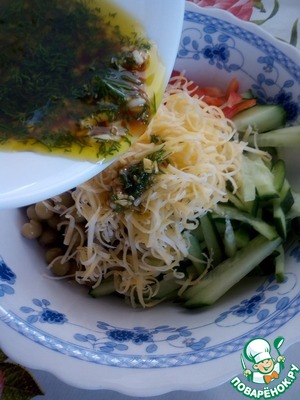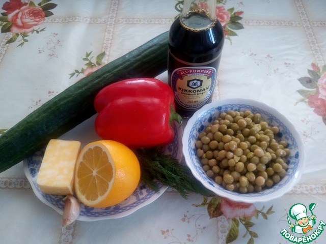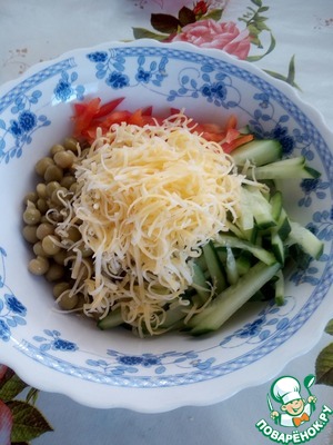 В чашку выкладываем нарезанный огурец, зеленый горошек, сыр и болгарский перец.