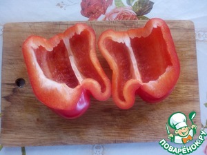 Болгарский перец разрезаем вдоль на 2 половинки. Очищаем от семян и перегородок. (От каждой половинки я отрезала тонкий кусочек перца и добавила в салат).