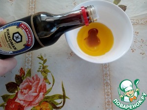 Готовим заправку для салата. В чашку наливаем горчичное масло и лимонный сок. Добавляем соевый соус "Kikkoman".