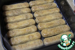 Уложить на дно печенья Савоярди, предварительно обмакнув их в кофе. -