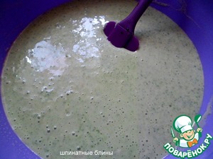 Вот оно хорошо подошло, добавляем к нему слегка взбитое яйцо, масло, шпинат, перемешать.