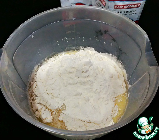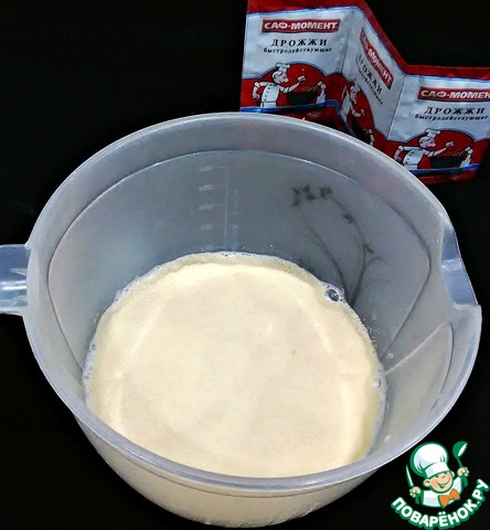 Далее добавить молоко, дрожжи и дать им распуститься. Рекомендую использовать быстродействующие дрожжи "Cаф-Момент", которые придают пышность и прекрасный вкус домашней выпечке.