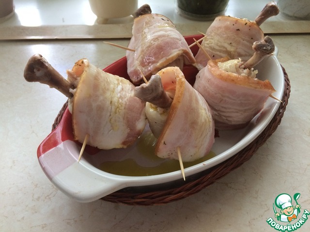 Оборачиваем беконом ножки, закрепляем зубочисткой и отправляем в духовку на 30 минут при 200 С.