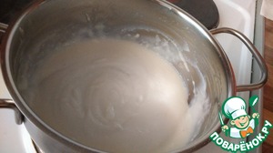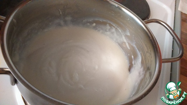 Молоко нагреваем, подмешиваем муку и мешаем венчиком до густоты.
