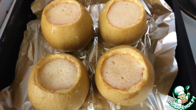 Вынимаем яблоки из духовки. Крем заливаем в яблоки и снова ставим на 15 минут в духовку при температуре 240 градусов. Готово!)