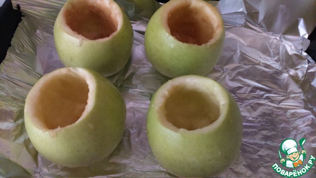 С яблок срезаем верхушку, вынимаем мякоть. Ставим в духовку на 10 минут при температуре 200 градусов.