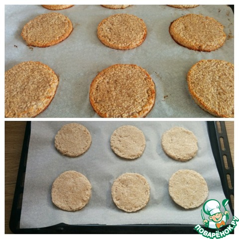 Формируем печенье (у меня получилось 9 штук диаметром 7,5 см) и выкладываем на застеленный пергаментной бумагой противень.