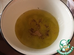 1. Смешиваем масло оливковое, сок лимона и апельсина, коньяк, сахар и корицу. Все тщательно смешиваем. -
