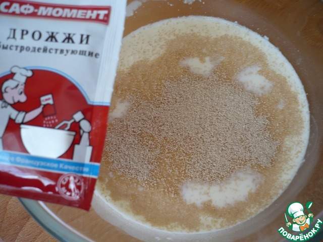 Молоко нагреваем до 40 градусов, но не выше, добавляем 1 ст. л. сахара и дрожжи "САФ - МОМЕНТ". Все перемешиваем и убираем на 10 минут в тёплое место для активации.