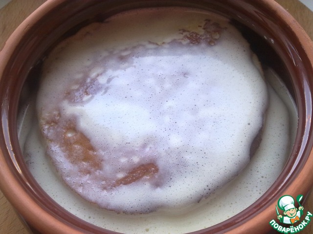 На дно глиняного горшочка выкладываем слой блинов и поливаем их частью заварного крема.
