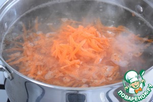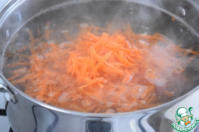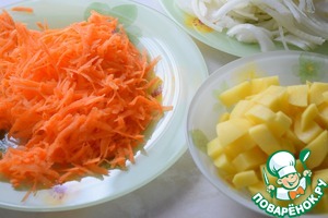 Морковь потереть на крупной терке. Картофель порезать кубиком.