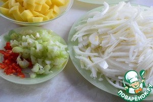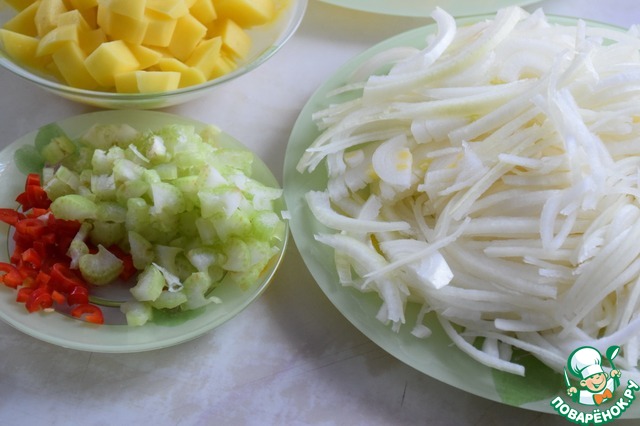 Лук порезать полукольцами, горький перец и черешковый сельдерей небольшими кусочками.