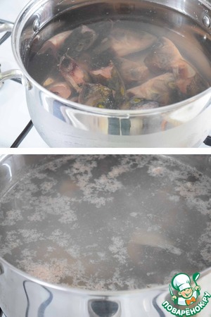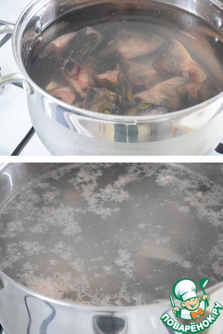 Очищенную и промытую рыбу порезать на кусочки, сложить в кастрюлю, залить водой, довести до кипения, снять пену и варить на самом маленьком огне примерно 20 минут.