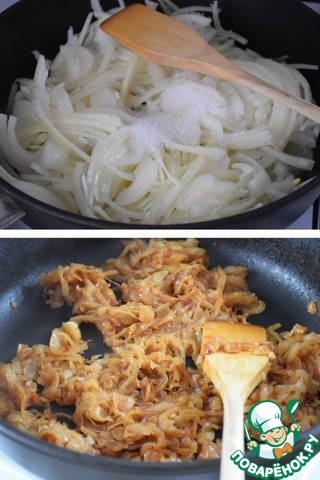 В сковороду добавить сливочное и растительное масло, разогреть. Добавить лук, сахар и обжарить, постоянно помешивая, до красивого золотисто-коричневого цвета.
