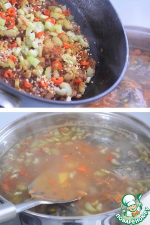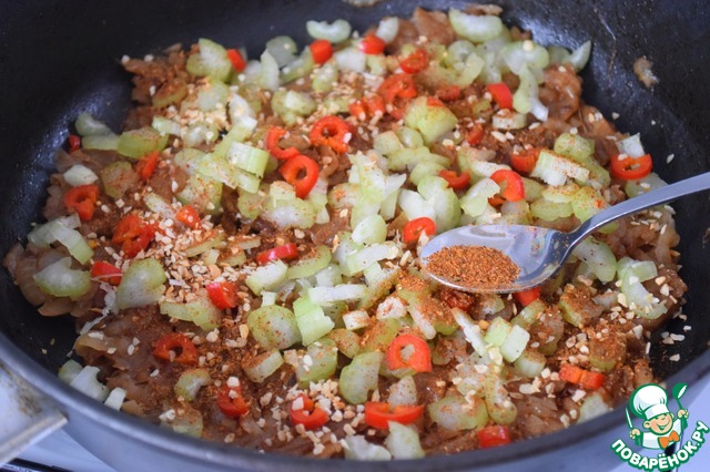 Разровнять обжаренный лук, выложить на него порезанный сельдерей и горький перец, добавить пропущенный через пресс чеснок (или сухой гранулированный чеснок), специи. Огонь отключить, сковороду закрыть крышкой и убрать пока в сторонку.