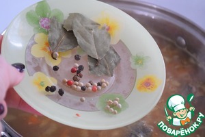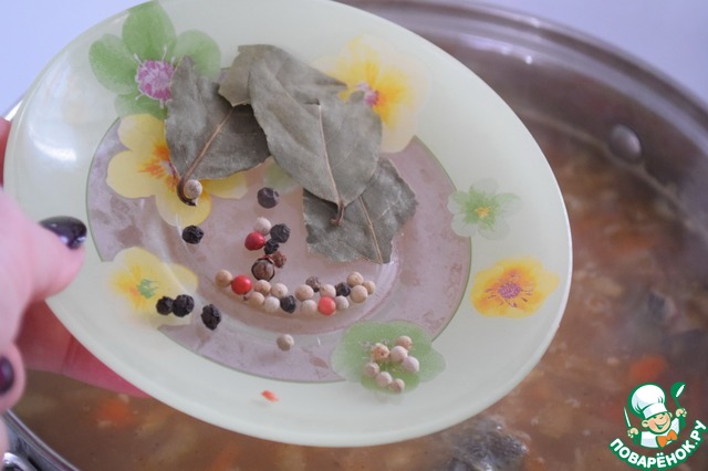 За 5 минут до окончания готовки, добавляем лавровый лист и перец-горошек. Пробуем на вкус, если нужно добавляем соль, специи.