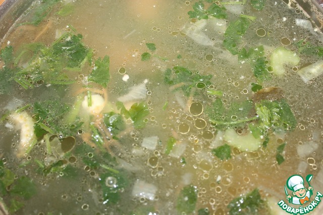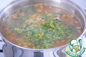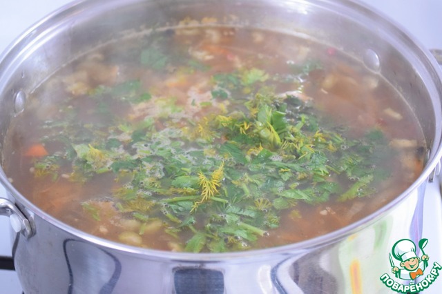 Добавляем порезанную мелко зелень, огонь отключаем и даем настояться супу минут 15-20.