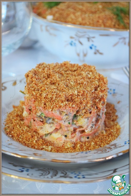 Хочу предложить Вашему вниманию интересный салат. Когда-то давно нашла его на страницах кулинарного журнала, чуть переделала под свои вкусы и предпочтения. Салат очень интересный, готовится быстро, продукты доступные, а изюминкой этого салата является сухарная крошка из вкусного домашнего хлеба! Угощайтесь!
