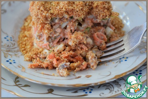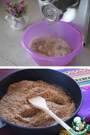 Сразу хочу сказать что салата получается много. Поэтому смело можете делить все продукты на половину. Итак, сухари пропустить через мясорубку с мелкой сеткой. На сковороде разогреть растительное масло и обжарить нашу сухарную крошку до приятного золотистого цвета. Убрать пока в сторонку.