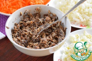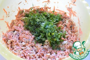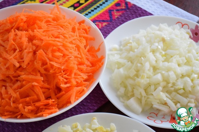Морковь натереть на крупной терке. Лук мелко порезать.