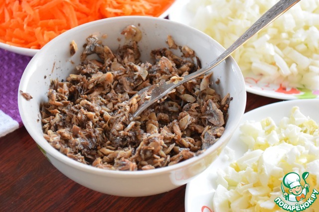 Рыбные консервы (если много жидкости, то ее слить) хорошо размять вилкой.