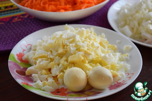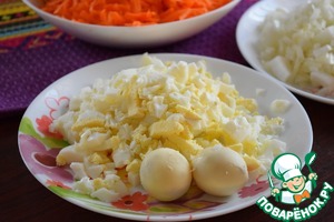 2 вареных желтка отложить в сторону - они нам понадобятся для соуса-заправки. Остальные яйца натереть на терке или порезать.