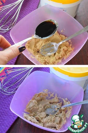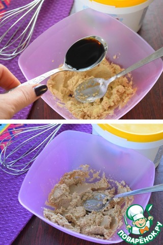 Займемся приготовлением соуса-заправки: в миску выкладываем желтки, добавляем горчицу и хорошо растираем ложкой. Затем добавляем соевый соус и еще раз хорошо растираем нашу смесь ложкой.