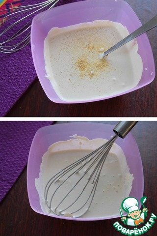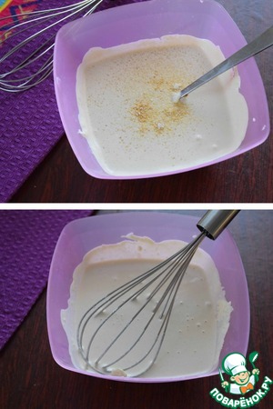 Перемешиваем соус-заправку ложкой. Добавляем лимонный сок и цедру лимона. Пробуем на соль и остроту, и при необходимости, добавляем соль и перец. Хорошо взбиваем венчиком 1-2 минуты.